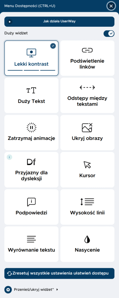 Po kliknięciu menu dostępności pojawia się szereg opcji wspierających poprawę czytelności strony